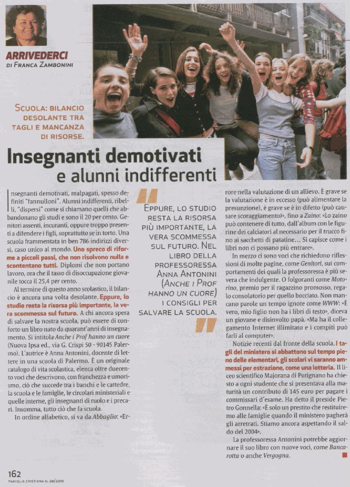 A chi spera ancora di salvare la nostra scuola può essere di conforto un libro nato da quarant’anni di insegnamento. Si intitola Anche i Prof hanno un cuore. (Nuova Ipsa Ed., via G. Crispi 50 – 90145 Palermo). L’autrice è Anna Antonini, docente di lettere in una scuola di Palermo. E’ un originale catalogo di vita scolastica, elenca oltre duecento voci che descrivono, con franchezza e umorismo, ciò che succede tra i banchi e le cattedre, la scuola e le famiglie, le circolari ministeriali e quelle interne, gli insegnanti di ruolo e i precari. Insomma, tutto ciò che fa scuola.